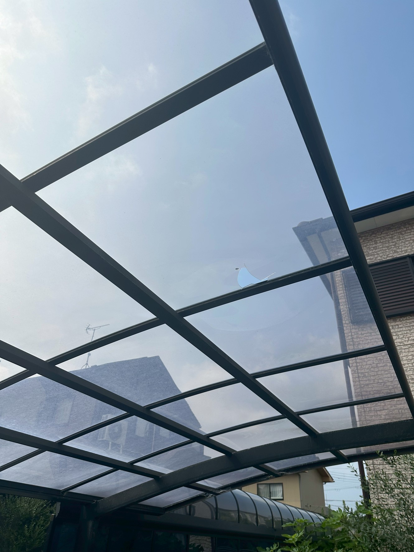 強風や経年劣化により、ポリカーボネート板が割れることがありますが、今回の場合は、昨年の雹(ひょう)での被害でした。